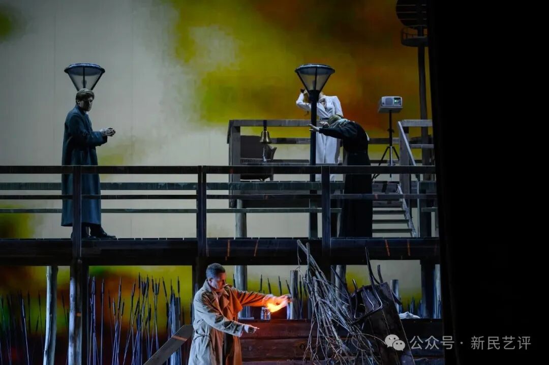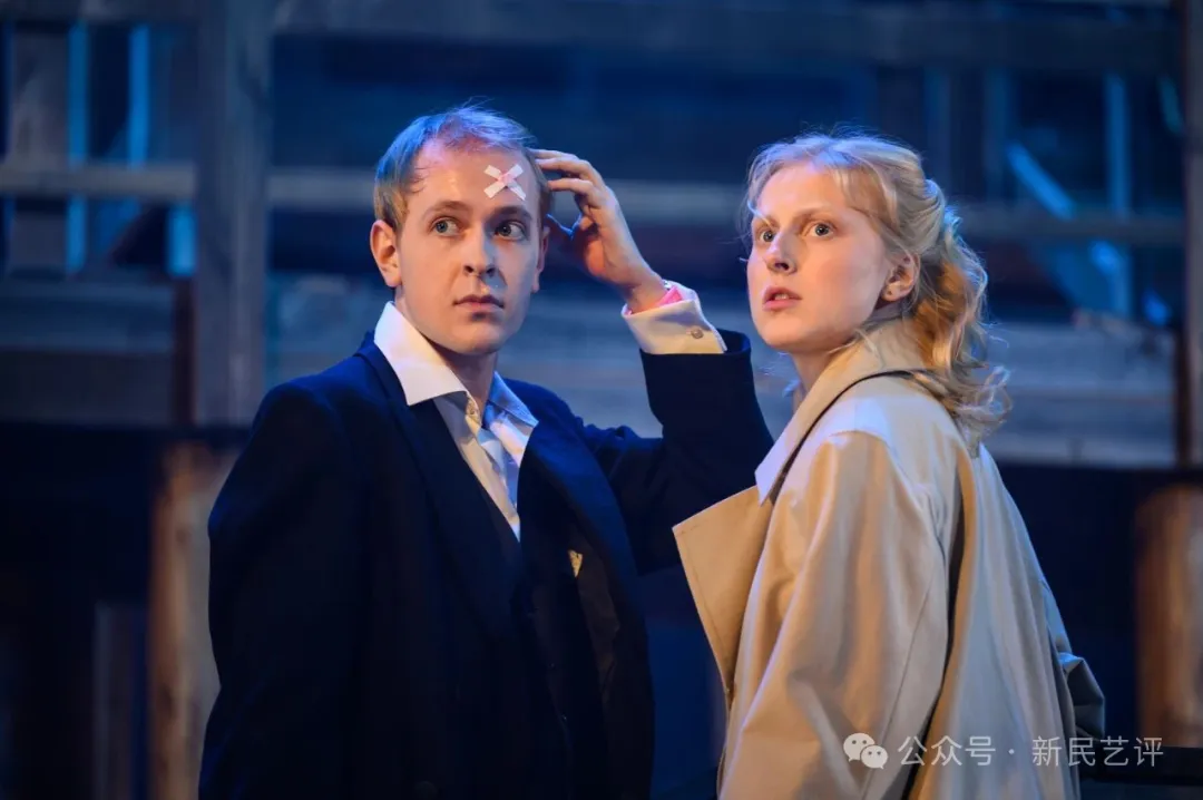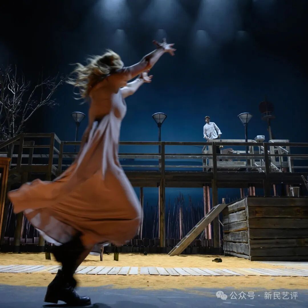 有关“现实”的另一个有力提醒,是台上二楼处安置的一台投影仪。木质结构的二楼右侧,有一台投影仪,整个儿天幕上的湖畔风光、海鸥展翅的影像都是投影仪投出来的。管家时常按它,当它被关掉,天幕黑屏时,就是“去掉滤镜”的现实时分。康斯坦丁甚至还能按出21世纪摩天大楼的画面——进一步提醒观众湖畔庄园是个“假象”。当伊琳娜按它时——天幕黑屏,现实出现:台上,观众看到了特里果林在书柜后偷情,只露出四只脚;而从伊琳娜的角度,刚好看到全貌……