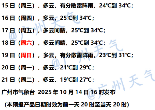 广州市气象台预计,10月15日-16日广州以多云为主,偶有(雷)阵雨,10月17-18日,多云间晴为主。10月19日,受冷空气影响,有分散(雷)阵雨,气温开始下降;10月20-22日,多云间阴天,气温继续下降,21日最低气温或将降至19°C,最高气温27°C。